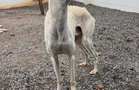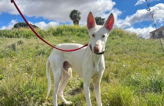 Temeroso con humanos, aunque va avanzando poco a poco. Sociable con todos los perros